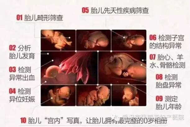 它能够多方位、多角度地观察宫内胎儿的生长发育情况,为早期诊断胎儿先天性体表畸形和发育异常提供科学依据。还能对胎儿的体表进行检查,如唇裂、脊柱裂、大脑、肾、 骨骼发育不良等,以便尽早的进行治疗。    玛丽亚目前已拥有三台四维彩超机器设备,是武汉乃至湖北拥有较多台四维彩超的妇产专科医院。四维彩超检查的专业性更强,因此它对操作人员的技术与经验要求很高,也只有准确熟练的手法才能达到最佳的检查效果,才能更好的向让准妈妈准爸爸们展示宝宝人之初的惊艳亮相。    在玛丽亚,为准妈妈做四维彩超检查的,均是资历深厚经验丰富的超声科专家。超声科带头人苏卓莉主任,曾在武汉市二医院、同济医院超声室进修,从事超声工作四十余年,尤为精通四维彩超的超声诊断,产前胎儿超声筛查诊断。    据数据统计显示,玛丽亚院临床已开展十万例四维彩超检查,用科学全面的数据分析,护航母婴健康,优生优育,让宝宝赢在超前起跑线。    尽管已经有三台四维彩超,但玛丽亚四维彩超排号情况还是很紧张,在此小编提醒准妈妈们,如确定要预约,一定要提前预约。及早预约能够自由选择时间,如预约得晚,很有可能排不上号。四维彩超预约方式如下:    2、微信预约:关注官方微信号(whsmlyfc),咨询预约    玛丽亚从建院以来一直实行“无假日诊疗”制度,一年365天,日日正常门诊,无节假、无休息,最大限度地解决广大患者节假日看病难的困惑,就医时间更自主,给孕妈咪们提供了更加快捷的就医行程。    温馨提醒:想要生一名健康的宝宝,除了四维彩超外,准妈妈们不能忽视三道防线:孕前检查、孕中期检查、孕后期检查。玛丽亚集三道防线一体化,并开展导乐无痛分娩等前沿技术,配备一流的产科专家和护理团队,为母婴健康护航。